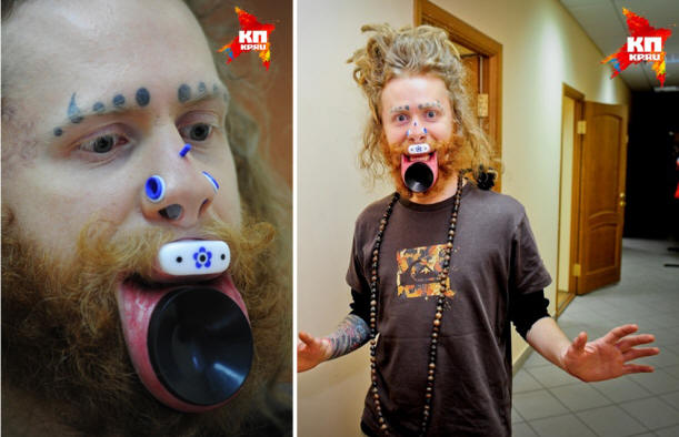 Evgeny Bolotov je modifikator tijela, eksperimentira na svom izgled. Na usnama ima tanjire, dno je istegnuto za 60 mm, odozgo za 33 mm. A planira da ih protegne “u beskonačnost”. Proteže i ušne školjke, napravio je tunele u nosu, a sada između čak i olovka može mirno proći kroz nosnice. On se takođe probio nosna hrskavica, a sada mu se nos savija, poput plastelina. Zhenya jako ponosan što je jedini vlasnik takvog pirsinga na planeti. – Ne, djeca ne plaču – smije se 27-godišnja Perma dizajner, – Ljudi ponekad upiru prstom, nasmiješe se očima pitaju me da se fotografiram sa njima. Tačno, momak se žali: in opasna permska područja imaju lice za svaki slučaj zatvoriti. Još uvijek nije jasno kako će se pravi dečki susresti, pozdraviti mračna ulica: nisu svi na Uralu to razumiju i prihvaćaju “lepota.”