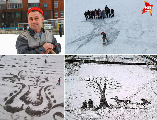 Svoje 52 godine Semyon Bukharin je radio kao vatrogasac i rudar. Penzionisao se prije tri godine. Dobio sam posao kao domar u školi. Onda i nisam mislio da će ovdje, dekorater po treningu, pronaći ovaj svoje zvanje. Umjesto četke – lopata. Umesto platna – škola dvorište. Ideja za stvaranje na snijegu došla je spontano – smislili su školarci. Takođe su postali zahvalni gledaoci. Semyon Bukharin nije voljan slava. Kaže da je to sve za djecu. Školota ga u odgovoru zove veliki umjetnik.