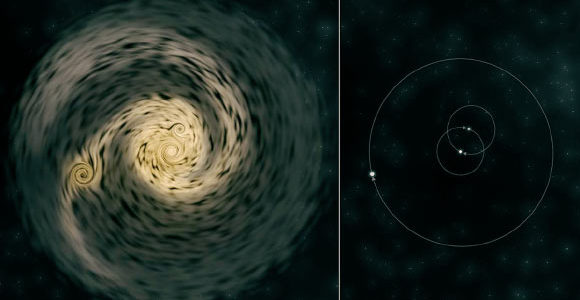 Zahvaljujući podacima teleskopa ALMA, instaliranog u čileanskoj pustinji Atacama, naučnici su primijetili vrlo neobičan sistem zvijezda, koji se sastoji od dvije mlade zvijezde smještene u središtu i jedne koja se nalazi na određenoj udaljenosti od njih.