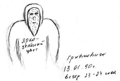 Izgledali su vrlo čudno … Niže od očevidaca, rast – jedva su mu dosezali nos (1,5-1,6 m, moguće 1,7) m), zašto ih je trebalo gledati kao da odozdo prema gore. Bili su obučeni u jarko zelene (kao da su svetlucave) kombinezoni, ostavljajući samo lice otvorenim. Glave su duboke, bez vrata ramena kao da su započeta u nivou uha. Sjećam se samo kako gosti su gledali u struk, o drugoj polovici tijela očevidac nije ništa nisam se mogao sjetiti. Lica bi se mogla zamijeniti za običnog čovjeka ako ne za više detalja …