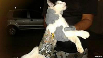 U brazilskom zatvoru zadržana je mačka na kojoj je pronađeni su predmeti namijenjeni zatvorenicima. Zabranjeno teret je bio pričvršćen na mačku trakom. Stražari su primijetili sumnjivog ljubimca kada je prošao kroz glavnu zatvorska kapija. To se dogodilo u zatvoru Arapiraka u Brazilska država Alagoas. “Napadač” je pokušao prokrijumčariti unutra zatvorske vježbe, datoteke, mobilni telefon s punjačem uređaj i slušalice Mačka je odvedena u lokalno sklonište životinje.