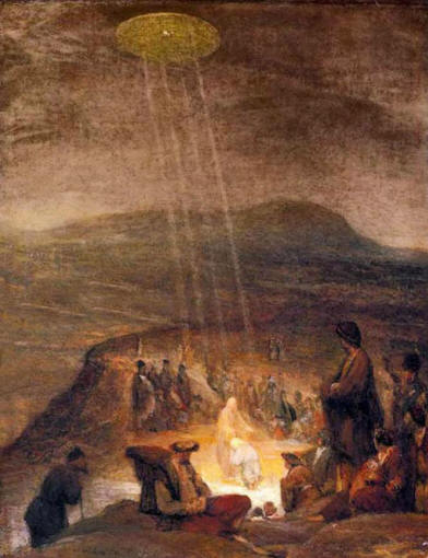 Slika “Hristovo krštenje” (Hristovo krštenje). Cambridge Engleska Slika je naslikala 1710. godine flamanski umetnik Arta de Gelder. Iznad je NLO koji lebdi nad ljudima. Od letenja ploče emitiraju zrak svjetlosti direktno na Ivana Krstitelja i Isusa.