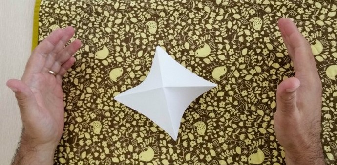 U te svrhe izrežite papirni kvadrat i napravite od njega svojevrsnu piramidu (kao što je prikazano na slici). Onda uzmi iglom, zalijepimo njezin tupi kraj u činovničku gumicu i na oštru na kraju smo objesili papirnu piramidu.