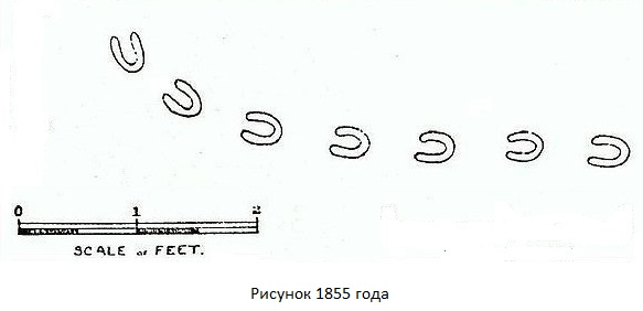 Ljudi su se počeli okupljati. Tragovi su bili izduženi glatki lanac uzastopnih na udaljenosti od 20-40 cm otisci poput kopita veličine 10×7,5 cm takav da stvorenje koje ih je ostavilo nije četveronožno, pa čak ni jedno dvonogi i jednonogi!