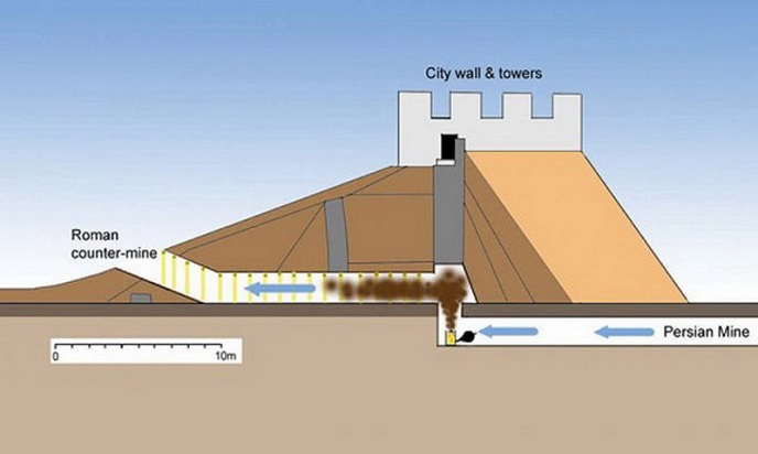 U 20-ima prošlog veka Francuzi zajedno sa Amerikancima otkrio grad Dura Europos u Siriji, uništen od strane Perzijanaca. Arheolozi su pronašli tunel za opsadu kroz koji su Perzijanci namjeravali infiltrirati se u grad. Rimljani su kopali šalter – uobičajena praksa borba sa tunelima od neprijatelja. I evo dva tunela su se upoznali.
