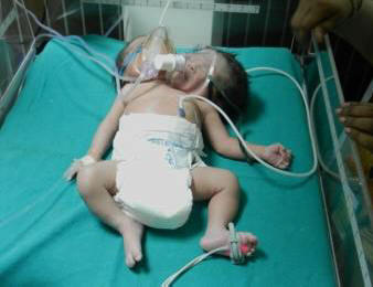 Fotografije iz otvorenih izvora Ljekari se boje da dijete to neće moći boriti se za život dugo jer je stopa preživljavanja novorođenčad sa sličnim abnormalnostima izuzetno je mala. Beba jedna stvar tijelo, dva vrata i dvije glave. Dijete je na intenzivnoj njezi.