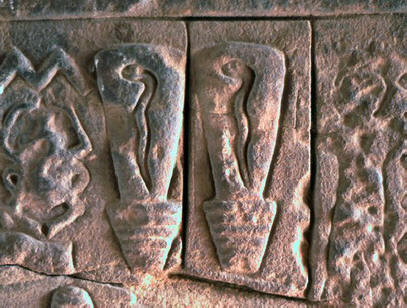 Ove tikvice ili mjehurići jako podsećaju na divovske električne sijalice sa zamišljenim vijugavim zmijama iznutra. Zmije su se krunile cvjetovi lotosa, pomalo podsjećaju na držače svjetiljki. Nešto slično kablu spojenom na kutiju blizu simbol moći je “jedni stup”, također vezan za zmije.