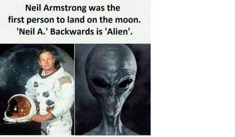 U jednom svom tvitu na poznatoj društvenoj mreži Twitter Ilon Musk je (bilo kao šala ili ozbiljno) izjavio da je prva osoba koji je posetio mesec, Neil Armstrong – nije tako jednostavno: ako pročitajte njegov kratki opis fotografija “Neil A.” obrnuto tada u togi dobijamo riječ “vanzemaljac” – “stranac”. A ispada to Američki astronaut – vanzemaljac.