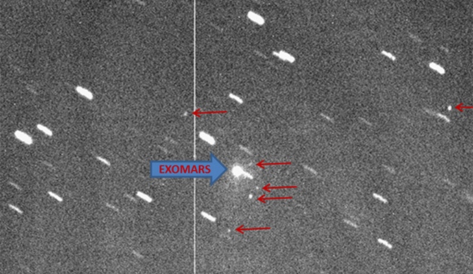 Na slikama koje je izložila Evropska svemirska agencija dana na njihovoj web stranici na kojoj se takođe slijevaju fotografije iz Australije, Brazil, Novi Zeland, primijetit ćete da stanica ExoMars, što na fotografiji izgleda kao prilično veliki svijetli objekt, prate u prostoru šest manjih vozila, sinkrono kreće se raketom za zemlju (na slici su dolje označeni) crvene strelice).