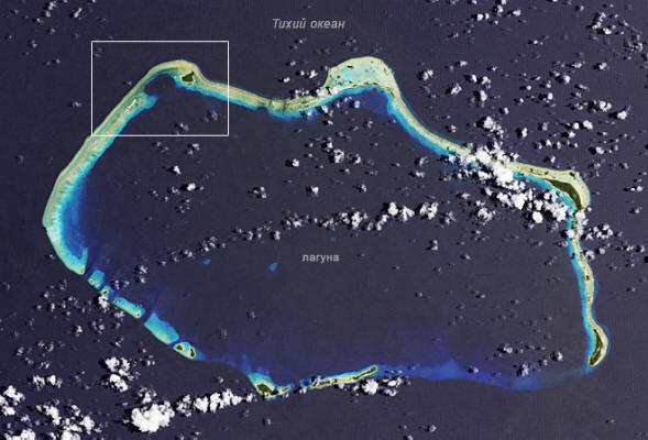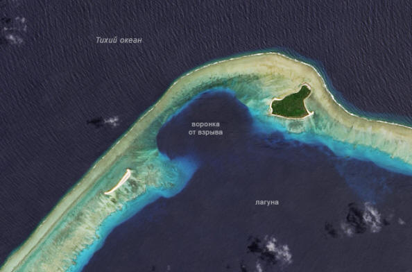 Atol bikinija, 19. avgusta 2013. © NASA Nakon eksplozije u zemlji atola i susjednih područja morskog dna pojavio se lijevak promjera oko 1,8 kilometara. Ispunjena vodom, mnogo se promenila Obrisi atola bikinija.