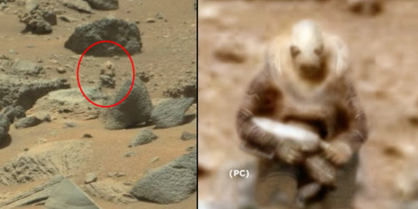 Vrlo čudnu i istovremeno zastrašujuću fotografiju otkrili su ljudi angažirani u detaljnom proučavanju fotografija rovera Curiosity – među marsovskim stijenama može se uočiti određeno dvonožno stvorenje, vjerovatno u skafanderu ili zaštitnoj uniformi.