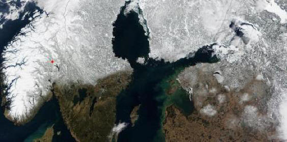Fotografija iz otvorenih izvora Ova fotografija je snimljena iz orbite NASA-in pratilac 15. marta 2002. Na njemu su zemlje Skandinavije. Crvena tačka označava grad Lillehammer, gdje je zima Olimpijske igre 1994.