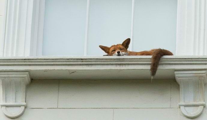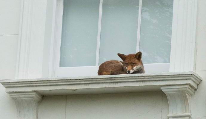 Fotografija iz otvorenih izvora Gradske lisice su notorne za svoje hrabrost i želja da se popnu na najzabranija mjesta. Stanovnici Londonsko područje Notting Hill zadivilo se kad su to vidjeli životinja na prozorskoj dasci lokalne kuće. Izgledalo je poput lisice odneta tamo samo niotkuda. U ovom slučaju ponašala se crvenokosa ljepotica apsolutno smiren i dremljiv većinu vremena.