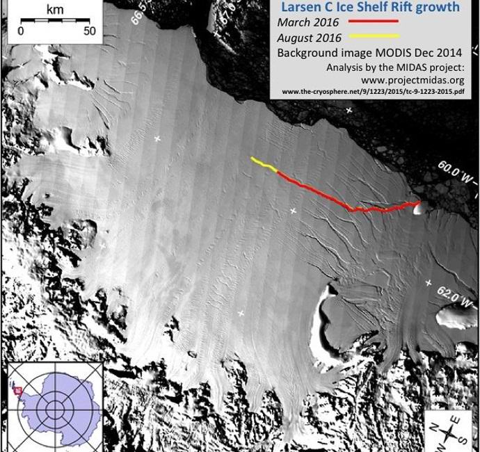 U nedavnoj prošlosti na Antarktici je postojala ledena polica. Larsen, kojeg je 1893. otkrio norveški kapetan kitolova Karl Larsen U početku je bilo područje ove ledene mase uporedivo sa površinom Jamajke i sastojalo se od tri konvencionalna dijela: “A”, “B” i “C”. Međutim, šezdesetih godina prošlog vijeka zbog porast temperature na Zemlji, ledenjak se počeo neumoljivo topiti, a danas je od nje ostalo samo delić „C“. Na njemu Američki naučnici i otkrili su potencijalno katastrofalnu za planetu greška