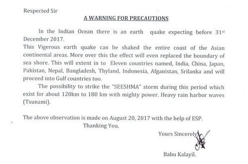Predviđanje budućnosti izvan nauke je grupa indijskih vidovnjaka i naučnici, među kojima je i Babu Kalayil, uglavnom nisu uključeni, međutim, videvši predstojeću, pa, upravo groznu, katastrofu u Indijskim oceanom, Babu Kalalaal jednostavno nije mogao ostati nijem iako nije Siguran sam da će se njegovo upozorenje čuti, a ljudi (naročito vlade ovih država) moći će nešto poduzeti kako bi se spriječilo da im se katastrofa približi.