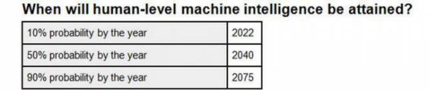 10% vjeruje da je inteligencija robota jednaka ljudskoj razlog do 2022 .; 50% vjeruje da će se to dogoditi 2040. godine, a 90% se slaže da će roboti postati pametniji od ljudi negdje do 2075. godine godine.