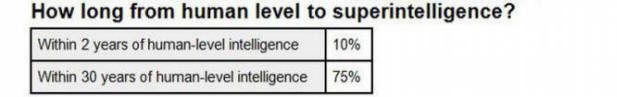 10% naučnika vjeruje da će se superinteligencija pojaviti za nekoliko godina; 75% ispitanika vjeruje da će se to desiti za 30 godina.