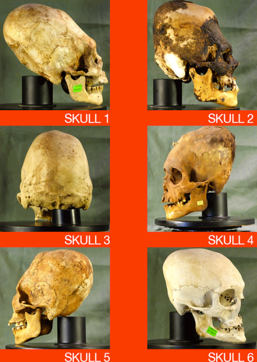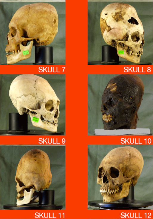 Fotografije iz otvorenih izvora Tello je generalno pronašao oko 300 njih lobanje, koje bi trebale biti stare oko 3000 godina. Nedavno na jednom od urađena je DNK analiza lobanja. Dao je stručnjak Brian Foster neke preliminarne informacije u vezi misterioznih lobanja. Uglavnom su izdužene lubanje rezultat namernih deformacije lubanje vezanjem ili ravnanjem glave i izlaganje dugog vremena. Takve postigao efekt, zavijanjem glave između dviju dasaka, ili povlačeći glavu krpom. Ova metoda je prirodno promijenila oblik. lubanje, međutim volumen, težina i ostale karakteristične osobine ljudska lobanja je ostala nepromijenjena.