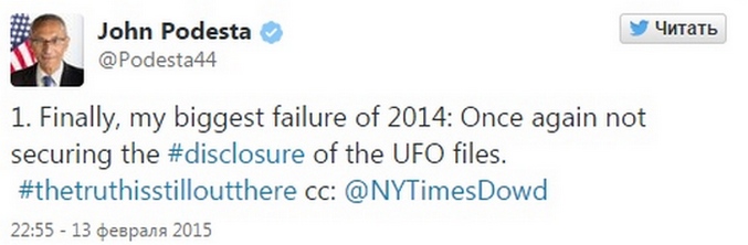John Podesta, savjetnik predsjednika SAD-a od 1 Januara 2014., objavljeno u petak, uoči Dana sv. Valentina Valentine, objava na njegovom Twitteru o kojoj se govorilo Politika američke vlade o neotkrivanju podataka povezan s NLO-ima.