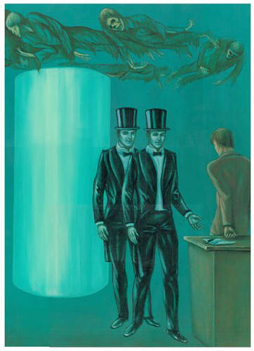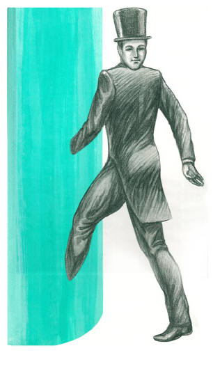 Začuje se tutnjava glasova, ali nije bilo moguće razabrati riječi … ali odjednom su svi naglo skočili gore i pojurili da bježe. Mogući razlog strah je bio izgled redovnih posjetilaca: iz svjetlosne kolone izašao muškarac obučen u crni kaput, bijelu košulju, na vratu bio je crni leptir, a na glavi cilindar iste boje. Lice i ruke su, poput prvog predmeta u smeđem džemperu, bile bijele boje, apsolutno bijele, kao da su bez krvi.