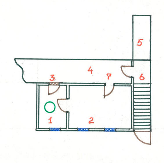 Opća šema podruma kuće. 1. prostorija u kojoj se otvorio portal; 2.Radionica susjednih soba; 3. Prikovana vrata s pogledom zajednički hodnik; 4. Zajednički hodnik podruma, koji se proteže cijelom dužinom kod kuće; 5. Underground N.V. Streltsova, gdje je pronađeno oružje; 6.Stepenice dolje s ulice i “garderoba” podrumskog hodnika; 7.Ulaz u radionicu iz podrumskog hodnika.