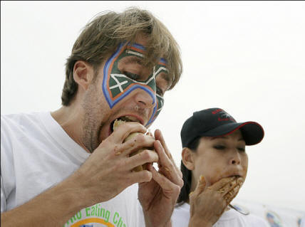Fotografija sa otvoreni izvor Takeru Kobayashi, atletski maloljetnik (foto Metro News). 2006. godine gastroenterolog David Metz iz Pensilvanije Univerzitet (SAD) je našao vremena za proučavanje redovitog stomaka takmičar u gađanju po imenu Tim Janus (broj treći na listi, pseudonim Eater X) i želudac normalna osoba nakon što su sjeli i pojeli 12 minuta hot-dogovi. Zbog visokog sadržaja barijuma u ovom proizvodu naučnik je mogao da opazi ponašanje stomaka u fluoroskopu. G. Metz htio testirati pretpostavku da plemeniti jedci imaju želudac brže oslobađa prostor otvaranjem stražnjih vrata u tankom crijevu. Pokazalo se da je istina suprotno: nakon dva sata, želudac Eater-X riješila se samo četvrtine pojedenog, dok želudac nije jedna izuzetna osoba bila je prazna za 75%. Negdje nakon sedmog posljednji hot dog se požalio da još malo, i osjećaće se loše, iako je fluoroskopija pokazala da se želudac samo malo rasteže veće od početne veličine. U međuvremenu, njegov suparnik je na slobodi progutao 36 sendviča, radi praktičnosti uguravši ih u usta u parovima i ne obazirući se na to da je želudac jako zazvonio, uzimajući gotovo cijelu gornju trbušnu šupljinu. Ni on se nije osećao bol, ni mučnina, ni sitost. Da li je moguće reći da ovo rezultat redovnog prejedanja? Ili se rodio takav? Dobro ispitivajući robin-bobbin-bubanj, gospodin Metz je zaključio da je u U ovom slučaju priroda je na prvom mjestu. Općenito, želudac takvi ljudi nisu veći nego inače, ali on ima zadivljujuće sposobnost opuštanja a da pri tome ne naštetite sebi. Istovremeno Ne mogu a da ne priznamo da je ovaj „poklon“ samo početak. Profesionalni učesnik takvih takmičenja je Eric Denmark (Eric Red, sedmi stomak SAD-a) vjeruje da bez svakodnevnog treninga dispenzirati, inače tijelo jednostavno neće moći gurnuti vani od mogućih. Ali zašto mehanizmi odbrane šute? Zašto ne regurgitacija? Eric Red priznaje da zapravo … dobro … samo još jednom progutate, i to je to. Moram to reći na ovome regurgitacija takmičenja smatra se porazom – brza hrana, penjala se hrana nazad. Takvi ljudi treniraju na vodi. Na početku karijere, sjeća se Red, jedva je mogao popiti više od 4 litre (zdravo, doktore) Kay Aberg, bio si u pravu), a sada si u prilici 9 litara u sjedećem položaju. Ovaj test i nije toliko fiziološki. (želudac se postepeno proteže), koliko psihološki: potrebno je naviknite se na rabelaisku senzaciju. Lako se zaustaviti kaže g. Danska, mnogo je teže naterati se da nastavite. Samo molim, nemojte slijediti ovaj primjer. Pripremio NewScientistički materijali.