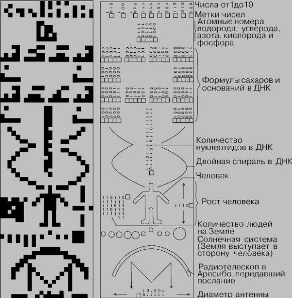 A piktogram na terenu nije samo kopirao Drakeovu poruku, u njemu su napravljene značajne promjene, to nije kopija, to je bila bio je odgovor. Vanzemaljska civilizacija nije mogla samo da čita poruku, ali i na sličan način prijavila svoju civilizaciju zemljani, što ukazuje na prilično visok nivo njegovog razvoja. On prvo mjesto, kao u zemaljskoj poruci, zauzimao je decimalni sistem s druge strane – brojevi atoma hemijskih elemenata, dokaz postojanja različitog biološkog života.
