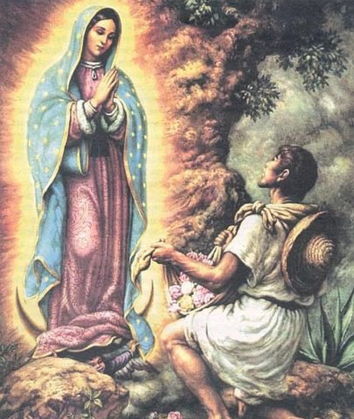 Budući da je crkva bila četrnaest kilometara od nje kod kuće, na putu koje je Juan morao jednom obilaziti brdo Tepeyak nekadašnje drevno azteško svetište. Međutim, ovoga puta nešto je išlo ne baš uobičajeno, jer je s brda dopirala divna muzika i iznenađujuće slatko pjevanje. A onda je i Diego prozvao ugodno ženski glas. Bila je Presveta Djevica. Nije jasno kako Juan je utvrdio da je to upravo Gospa, mora se pretpostaviti da je za bila je prije svega boginja Tonatsin, pogotovo otkad, prema Aztečki opis, žena je bila crna, što nije baš konzistentno sa tradicionalnom slikom majke Isusa Hrista.