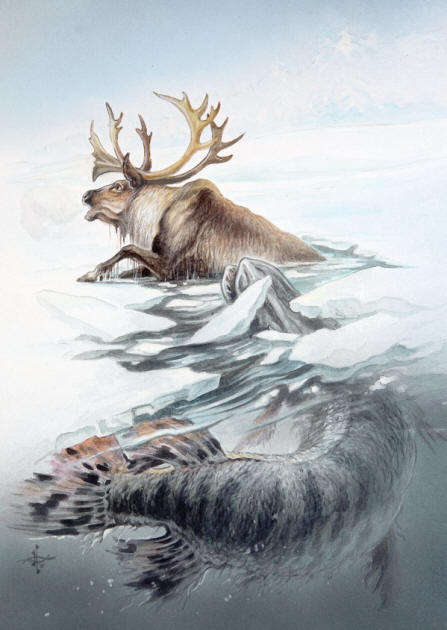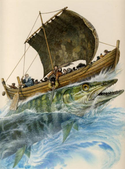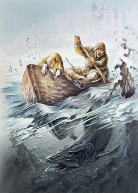 Legenda o kanadskom Eskimosu govori koliko je gigantsko riba je jela dva ribara odjednom. Dogodilo se to kada su tri muškarca prešao veliko jezero kod Saninjoka. Dvojica su bila vezana kajajući se međusobno, treći je plivao odvojeno i odjednom začuo glasan krik u pomoć. Ova ogromna riba napala je obveznice kajacima i progutao ih. Eskimo je shvatio da spašavanje drugova nije uspjeti i brzo otplivali do obale. Čudovište je krenulo za njim. Je utrkivao se tako brzo da je vozio ispred sebe, pa su se gurnuli kajak naprijed. Čim je čamac dotaknuo obalu, iskočio je čovjek i pobegao.