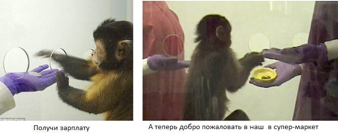 I evo, eksperimenti su napravili revolucionarni korak: umjesto Počeli su izdavati robu kapucinskim “plaćama” – limenim žetonima. Dečki su se jako brinuli hoće li majmuni pogoditi tu plastiku jesu li kartice ista banana, ista jabuka, ista čokoladica? Majmuni pogađaju. I baš pred našim očima počeli su da se “humanizuju”, stječući sve ljudske težnje i poroke.