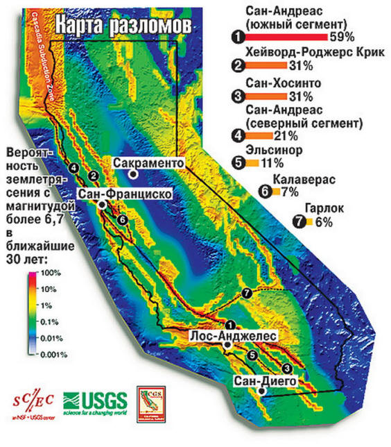 Najautoritativniju prognozu UCERF-a sastavila je grupa naučnika i stručnjaci iz SAD-a. Najvjerojatnije mjesto za snažni potres je Jug Kalifornija, ovo je mjesto gdje posljednje tristo godina uznemiruju. smirenost. Prema prognozi UCERF-a, potres M≥6.7 dogodit će se s vjerojatnošću od 99,7% u sljedećih 30 godina. Isti studija daje 46% u korist mogućeg zemljotresa sa snagom M≥7.5 tokom istog perioda. Istraživanje međutim održan prije 4 godine. A za to vreme uslovi su se promenili i promjenjivi faktori koji su trebali utjecati na finalni rezultat.
