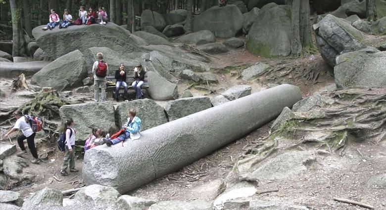 Grani ove kamene rijeke zanimljivi su ne samo u boji, već i u oblik, od kojih su neki jasno umjetnog porijekla, jer imaju tragove mašinske obrade. Zašto strojarnica? Slučaj u da su svi ti “šljunak” dioritski koji se mogu liječiti samo dijamant. Ali reci mi kako su drevni ljudi mogli dati pravo formiraju ta fantastično tvrda kamenja bez čak savremena tehnologija? Pogledajte samo stupac koji je odmah pored ovog kamenog potoka u šumi: ko je njime upravljao stvoriti?