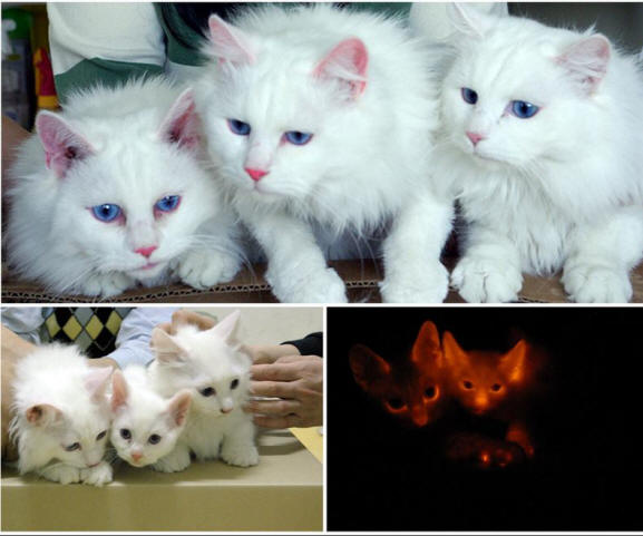 2. Ova snježno bijela mačića djelo su genetičara iz Južne Koreje. Tim naučnika stvorio je tri klona mačke s modificiranim DNK. Koža ovih životinja svijetli crveno pod utjecajem ultraljubičaste zrake. Korejski istraživači smatraju da je njihovo rad će pomoći u liječenju ljudskih genetskih bolesti i životinje.