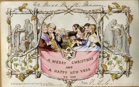 Ispada da je prva serijska božićna čestitka štampano u Londonu 1843. Povratak u viktorijansku Englesku domaće rukom pisane božićne čestitke uživale su ogromno popularnost. Međutim, inovator tog vremena, sir Henry Cole, odlučio je pojednostaviti taj proces uz pomoć kartice – snimiti. Iskorištavanje prednosti nova tehnologija štampanja, Cole je naručio umjetnika John Horsley osmisliti praznični pozdrav i 1843. pušten 1000 primjeraka. Nakon toga Cole mu je čestitao porodica i prijatelji, a preostale su karte prodate po cijeni jednog šilinga za svakog. 1851. godine Cole je igrao važnu ulogu u skladanju Velika izložba u londonskom Hyde Parku (sada su to Victoria i Alberta). Njegova razglednica prepoznata je kao prvi komercijalni Božić razglednica, od kojih je danas sačuvano 20 primjeraka biblioteke i arhive. A 14. decembra ove godine njegov sin se prodao Aukcija u Velikoj Britaniji jedne od rijetkih, neobojanih kopija Coleove kartice za 4200 eura. Razglednica pokazuje prijateljsku porodicu, koja okupili smo se da proslavimo Božić, tamo objavljeni transparent na kojem piše: “Sretan Božić i sretna Nova godina Vi “! Ovu su inovaciju Sjedinjene Države brzo presrele, od još jedne rane božićne čestitke iz kolekcije Grossman, koji je štampan u Filadelfiji 1850. god. takođe izlaže porodicu od 5 osoba okupljene okolo ognjište i sluga koji postavlja svečani stol. Ostalo Viktorijanske serijske kartice više liče na poznate nas božićne čestitke, jer obično prikazani snjegovići, Djed Mraz, crvene čarape za poklone, vijence igle i mršteći djecu. Međutim, napravljene su neke razglednice Grossmanova knjiga “Božićne radoznalosti”, modernog izgleda može se činiti pomalo čudnim: Krampus se povlači i spušta loša djeca u podzemlju koja se ljube s borovima, paleći cigaretu od božićnog drvca Djed koji ukrašava miša stabla; mačke igranje snega. Razglednice sa životinjama koje se ponašaju kao ljudi i dalje možeš razumjeti, ali kako voliš razglednicu sa slikom mrtve ptice i natpis: “Možda će barem tvoj Božić biti više radosna “?