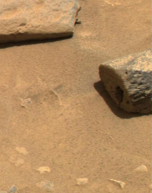 Slika je snimljena 106. dana boravka robota Spirit na Marsu. A on – ove vrste – nije prvi. Samo 15. dana slijetanje i vožnja na Marsu 3 metra, robot se također fotografirao kamen s kvadratnom rupom. Nalazi se još „škakljivo“ – na kraju. I ovo krajnje lice izgleda obrađeno – kao da je odsečeno pod pravom linijom ugao. A i sam kamen izgleda poput drške iz posude.