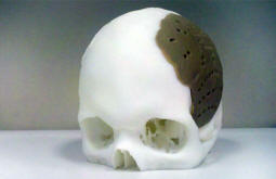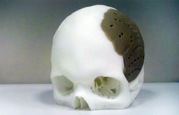 Fotografija iz otvorenih izvora Tri četvrtine svih kostiju lubanje Američki pacijent je smenjen u martu tokom neviđenog vremena operacije. Hirurzi su koristili implantat otisnut na 3D štampač u Oxford Performance Materials (stanje) Connecticut). Nova lobanja je napravljena prema magnetnoj rezonanci tomografija iz polukristalne termoplastike PEEK.
