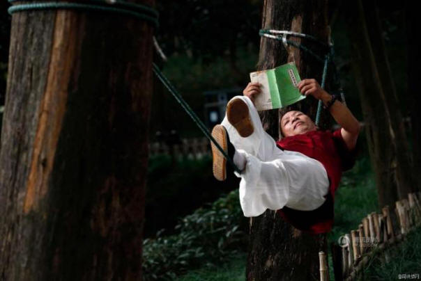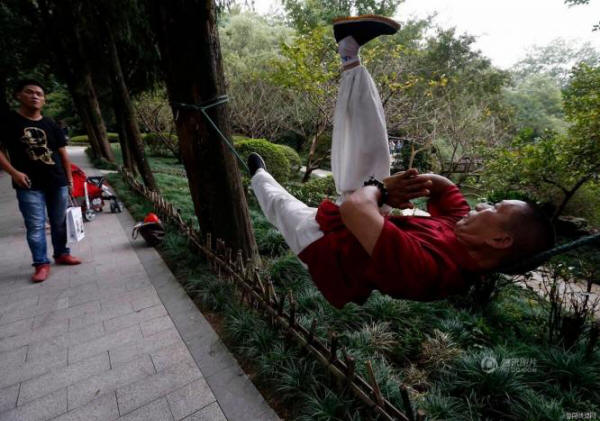 U parku grada Hangzhou u provinciji Zhejiang, Kina, možete videti 51-godišnji muškarac koji leži na istom užetu je Liang Yang (Liang Yanguo) nadimak “Kung Fu Man”. Odmor u takvim Kinez se osjeća toliko samouvjereno da je slobodan podiže ruke, noge i čak pozdravlja prolaznike, piše Odd Centralni