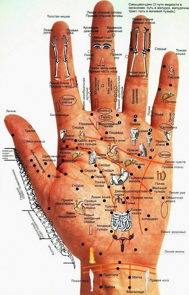 I za to je dovoljno upoznati se sa komunikacijskom shemom pojedinca točke i zone dlana s našim unutrašnjim organima i drugima karoserijski sistemi. A ako imate, na primjer, slabo srce masirajte češće, pritisnite je (po mogućnosti sa esencijalnim uljima) odgovarajuće točke u sredini (bliže lijevoj ivici – vidi šema na fotografiji) dlan. Ako vas boliju noge, masirajte falange prstenasti prst i tako dalje.