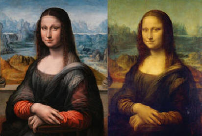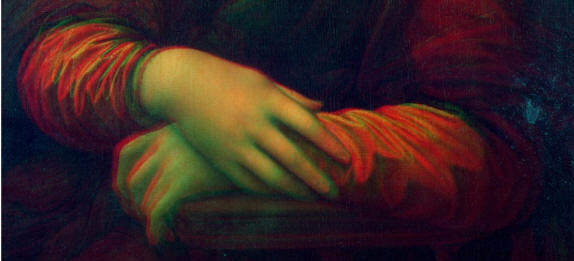 To znači da da Vinci nije pristupio pitanju 3D slika samo teoretski, ali i eksperimentirao u praksi. At pogled na originalne boje ove dvije slike postaje uočljiv da je jedina prava razlika samo u rukavima Mona Lize. On na jednoj slici rukavi imaju crvenkastu nijansu, a na drugoj – zelenkast. Neki stručnjaci sugeriraju da je ova boja razlika je Leonardo nagovještaj da su njegove slike potrebne pogledaj kroz crveno-zelene naočale. Drugi vjeruju da su sve to činjenice nisu dokaz namjere stvarajući da Vinci stereoskopski efekat za njegov Giocond. Na primer, razlike između dve slike na drugim delovima tela, kao nije u rukama, nije pogodan za stvaranje stereoskopskog para. Osim Štaviše, činjenica da su razlike u većim dijelom orijentirano okomito, a ne vodoravno, kako bi to trebalo biti. Idealno horizontalno neravnoteže bi trebale stvoriti odgovarajući 3D dojam da u uglavnom se nalazi u području ruku Mona Lise. Ovaj je dio i jedno i drugo slike mogu nazvati najdivnijim i najintrigantnijim područje trodimenzionalnog efekta, posebno ako uzmete u obzir da je Mona Lisa nastale su početkom 16. veka.