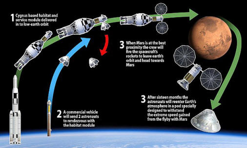 Fotografije iz otvorenih izvora Početak misije planiran je za period od 25 Decembra 2017. do 5. januara 2018. U ovo će vrijeme biti Zemlja i Mars biti na minimalnoj udaljenosti. To zbližavanje je takvo zvana konfrontacija – dešava se svakih 15 godina. Prema proračunima povratni let trajat će 501 dan. Povratak na Zemlju zakazan je od maja 2019. godine. Niko neće sletjeti na Mars. Samo posadu letjet će oko nje na nadmorskoj visini od 160 kilometara. Tito misli da će tako biti dobar početak ere krstarenih letova na druge planete. Milijarder očekuje da će mu pomoći: i američka vlada – novcem, a NASA s tehnologijom. Konkretno raketni SLS (Space Launch Sistem), sposoban za prijevoz teških tereta. Prema planu Tito, SLS stavit će u orbitu Zemlju svemirski brod koji odletjet će na Mars, te kopno koje bi trebalo sletjeti Zemlji kada se astronauti vrate. Astronauti na brod isporučiće komercijalnu raketu. Preći će u modul za stanovanje zapremina od oko 20 kubičnih metara, uključivat će jedinicu za ubrzanje i oporavit će se do Marsa. Uzorak leta