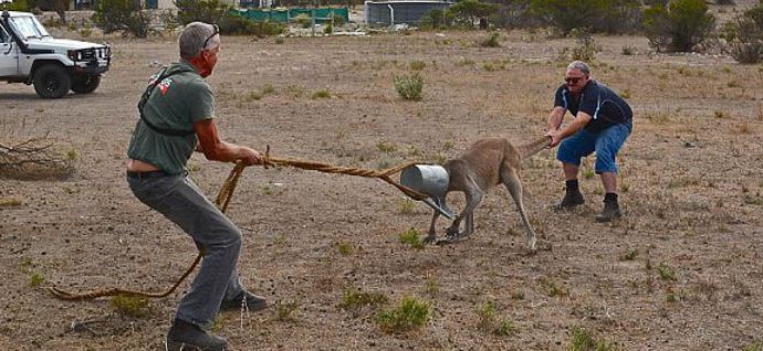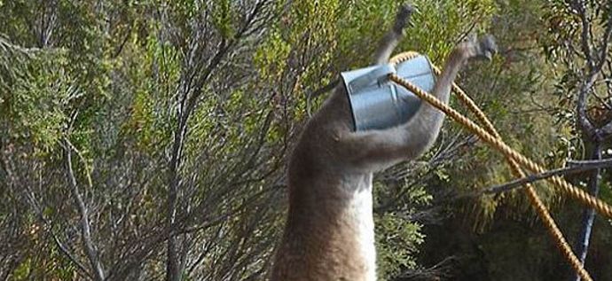 U našem slučaju dva čovjeka Steve Dew i Rob Smith spašavaju životinju, i ne samo životinju, već i tinejdžerski kenguru koji, jer glupa znatiželja ili zbog žeđi zaglavio sam glavu u kanti za zalijevanje, gde se zaglavila glava.