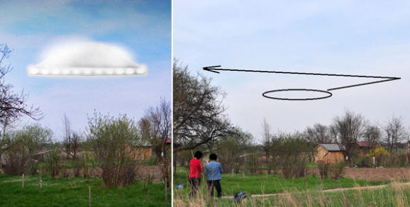 Uz njegov donji dio bio je niz sjajnih svjetala. Kako primijetili su očevici, uprkos sunčanom vremenu, objekt nije baci sjenu na zemlju. Nakon minut, predmet je krenuo vrlo sporo pomičite se preko drveća. Kad je jedna od žena izvadila svoj mobilni telefon za fotografiranje NLO-a, potonji se uključio 90 stupnjeva i velikom brzinom počelo se udaljavati unutra penjanje na sjeveroistok, skrivajući se iza drvo. Obilazeći drvo, žene su vidjele samo vedro nebo. Izgledalo je kao da je objekt jednostavno „nestao“.