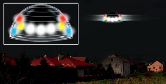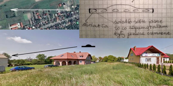 U početku se činilo da je u pitanju avion, ali je predugo trajalo zaglavili na istom mestu. Očevidac je uzeo dvogled (8×30) i kroz nju je smatrala da su svjetla na tamnom metalu predmet koji je vjerojatno u obliku kupole s ravnim dnom. Predmet se činio velikim. U potpunoj tišini podigao se iznad kuća visina ne veća od 200 metara (oko 20 stepeni iznad horizonta). Svetla smješten na vodoravnom donjem dijelu. Sa bočnih svjetala kvadratnog oblika, svjetlosni snopi su se razišli.