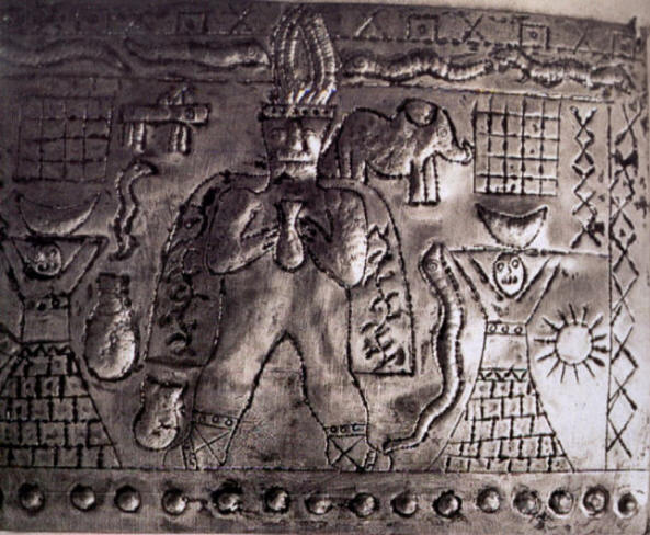 Ispada da su ljudi mnogo prije trenutne ere astronautike znali sferični oblik zemlje. Druga figura poda ima pravokutnik tijelo i okrugla glava. Ovo čudno stvorenje stoji na kugli globusu. i drži u “rukama” mjeseca i sunca. Takođe sam pronašao lik koji naziva “klaunom” ili “pilotom”. Na glavi je kaciga sa slušalice, rukavice na rukama. Na njegov kostim koji podsjeća pričvršćen svemirski odijelo, prsten i žice.