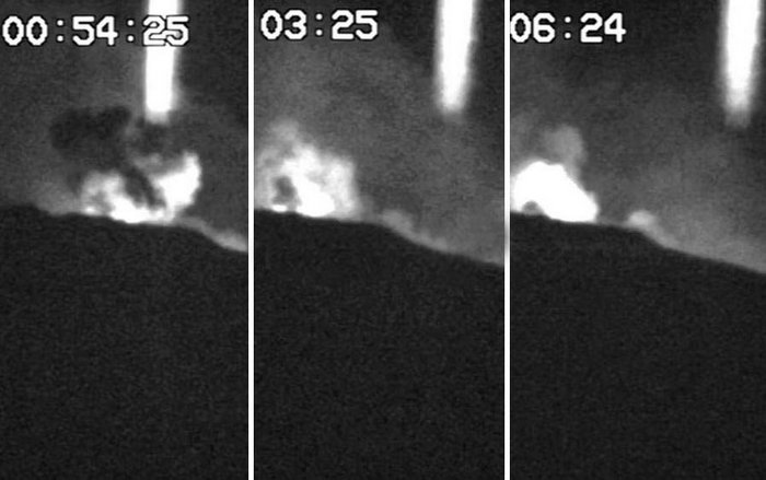 I evo novog iznenađenja koje je Etna priredila ove godine – svjetlost stup, koji se tu pojavio oko ponoći od 17. do 18. marta. Njegovu snimio nadzornu kameru s IR filtrom, koji radi u Automatski način rada s intervalom snimanja od 8 sekundi.