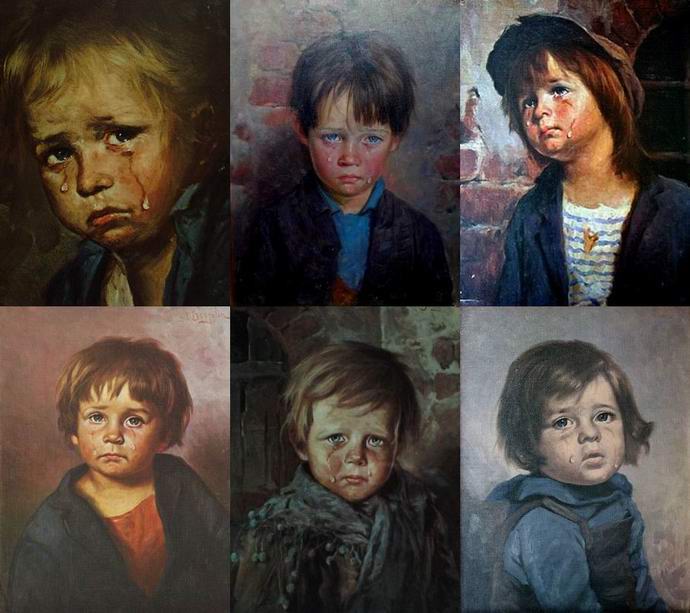 Slika koja prikazuje crvenokoseg mrkog momka sa suzama obrazi okruženi pravim oreolom misticizma. Ima ih mnogo dokumentovani dokazi da je svaka reprodukcija ovo je platno “zapaljivo” i izaziva požar, ma gdje se nalazio spustio slušalicu. Istovremeno, sam „plakajući dečko“ iz nekog razloga ne gori, često ostajući jedini preživjeli predmet na pepelu. Preko do danas nije sačuvana originalna slika, kako se veruje, tako jaka kletva visila da čak i reprodukcije uzrokuju požari i oduzeti ljudske živote.