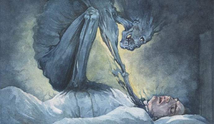 Crna figura, ništa ne podsjeća na žensku, s ogromnim, u pola lica sa očima koje pale žutu vatru, zagrize se za vrat žrtve i misteriozni zvuk nije bio ništa drugo nego škripanje zuba na vratu kralješci nesretnih. Čovjek je samo stenjao jedva čujno.