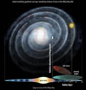 Koristeći podatke “vrlo velikog teleskopa” koji se nalazi u Čile, istraživači predvođeni Gerryjem Gilmoreom iz Sveučilište Cambridge (Velika Britanija) pokazalo je to, sudeći po distribucija hemijskih elemenata u galaktičkom disku, naša Galaksija se najprije formirala na područjima koja su u blizini jezgre, i tek tada je postepeno nabrekao u svim smjerovima. Prvo mliječno Staza je bila mnogo kompaktnija, i samo dok je rasla i upijala se susjednim galaksijama, proširila se na svoju modernu periferiju. (Ovdje i dolje su ilustracije Wikimedia Commons, Joe Parks, Gaia-ESO.) Masivne zvijezde, najčešće proizvode ove ili one elemente, uključujući magnezijum, raspršite ga oko susjedstva u eksploziji, čime se završava njihov životni ciklus. Iako je to odavno poznato pratiti raspodjelu magnezijuma u različitim zvijezdama Galaksije dugo nisu uspjeli. Ovaj put astronomi su uporedili sadržaj magnezijum u takozvanom solarnom krugu – onaj deo galaksije, koja se nalazi unutar orbite sunčevog kruga koji kruži oko središta Mliječni put. Pokazalo se sledeće: svetiljke su tamo bogate magnezijum mnogo češće od njihovih analoga izvan ovog kruga. At izvan kruga, zvijezde mogu biti obojene metalima ili siromašni, ali njihova prosječna dob je mnogo manja nego unutar kruga, pa čak i uz općenito visoku metalnost, imaju manje magnezijuma nego svjetiljke bogate teškim elementima unutar “Solare” krug. “Između ostalog, pokazalo se da su zvijezde u mladima galaksije ‘tankog diska’ mlađe od 8 milijardi godina, gotovo sve odlikuje sličan stupanj metalnosti, bez obzira na da li žive sedam ili milijardu godina. Štaviše, mnogi od Vrlo su bogate teškim elementima.
