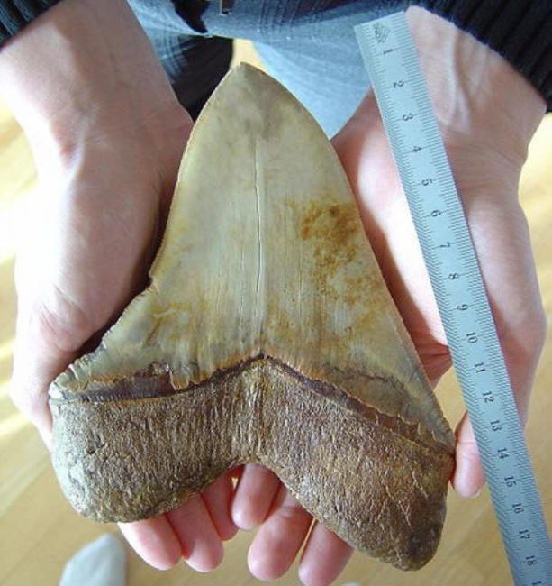 Ogromni zubi koji postoje širom oceana, o čemu govori nevjerovatno rašireno megalodonsko naselje, ima trokutasti oblik i podseti na morske pse. Razlika je samo u skali. Zub je najveći – Velika bijela ajkula – ne prelazi 6 cm megalodon najskromnija “fang” dostiže 10 cm, ali normalno veličina za njih je 17-18 cm.