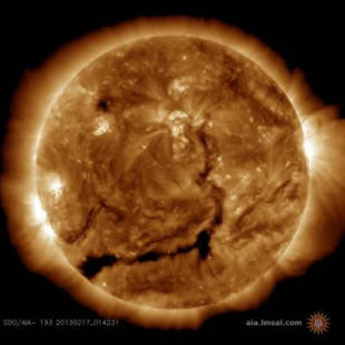 Fotografija iz otvorenih izvora Koronalna rupa na disku Sunca, 17 Februar 2013 © SDO | NASA temperatura u oblastima oko sto puta manji nego inače. Stoga koronalne rupe u Rendgenski raspon izgledaju tamna područja. Od tada profil trenutne rupe se stalno mijenja dojam da se preko Sunca puzi ogromna zmija. Poslednji put na disku zvijezde na kraju je predstavljena životinjska tema Januara. Naučnici pripisuju veliku ponovljivost koronalnih rupa period remisije je vrijeme minimalne solarne aktivnosti.